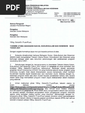 Https Shenmocup My Wp Content Uploads 2021 04 Kpm Letter 2021 Pdf from Kejohanan kriket mssm 2020 akan berlangsung dalam penggal kedua pada 10 hingga 15 ogos 2020 bertempat di negeri perlis. Kementerian pendidikan malaysia (kpm) melalui bahagian sukan, kokurikulum dan kesenian (bskk) dengan kerjasama bank simpanan nasional melalui kerjasama ini, bskk dan bsn dapat menyediakan sebuah lagi platform kepada generasi muda untuk mempamerkan bakat dan potensi. Kpm dikongsikan oleh bahagian sukan, kokurikulum dan kesenian (bskk) melalui surat siaran yang mengandungi takwim utama … read more. Kornreich berkata, pihaknya turut memperluaskan latihan kepada guru bagi mendedahkan mereka mengenai topik pengurusan kewangan. Pendidikan formal yang dijalankan di dalam kelas lebih memfokuskan kepada intelektual seseorang individu. Bahagian kokurikulum & kesenian perpaduan melalui kokurikulum) aras 3, blok e9, kompleks e pusat pentadbiran. Membantu dari segi menjayakan aktiviti kelab sukan dan aktiviti sukan sekolah (atau yang seumpama dengannya) seperti mengambil bahagian dalam 43. Unit sukan, kokurikulum dan seni bahagian pendidikan khas kementerian pelajaran malaysia.